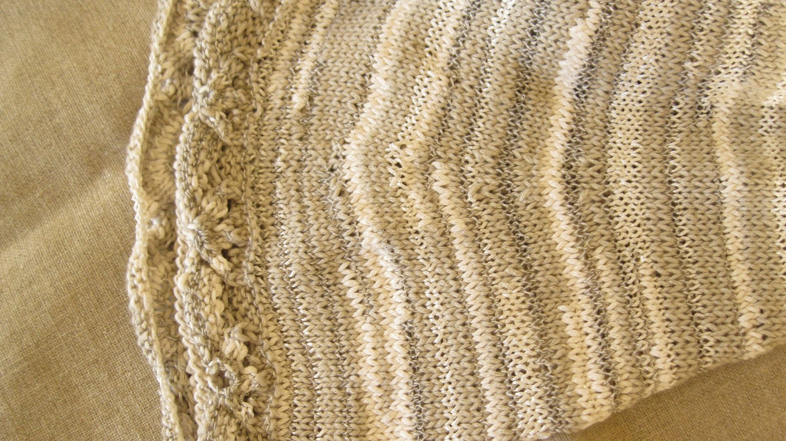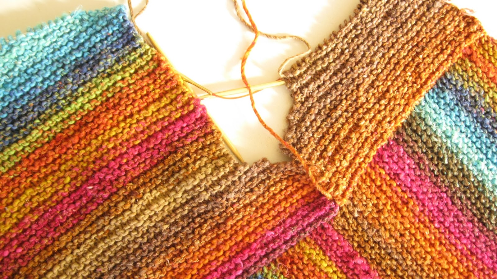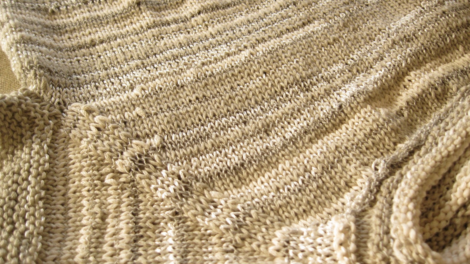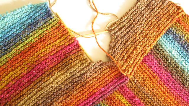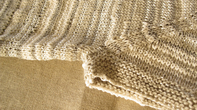 Mas nem tudo é linear quando se trabalha com cores que variam muito gradualmente ao longo do fio. Nestes casos a peça fica com riscas coloridas, tanto mais largas quanto menor o número de malhas das voltas. Se isso é muito giro em écharpes, xailes, cachecois, tratando-se de uma peça para vestir, aí o caso muda de figura.