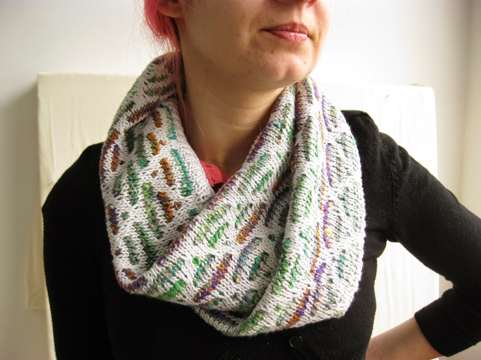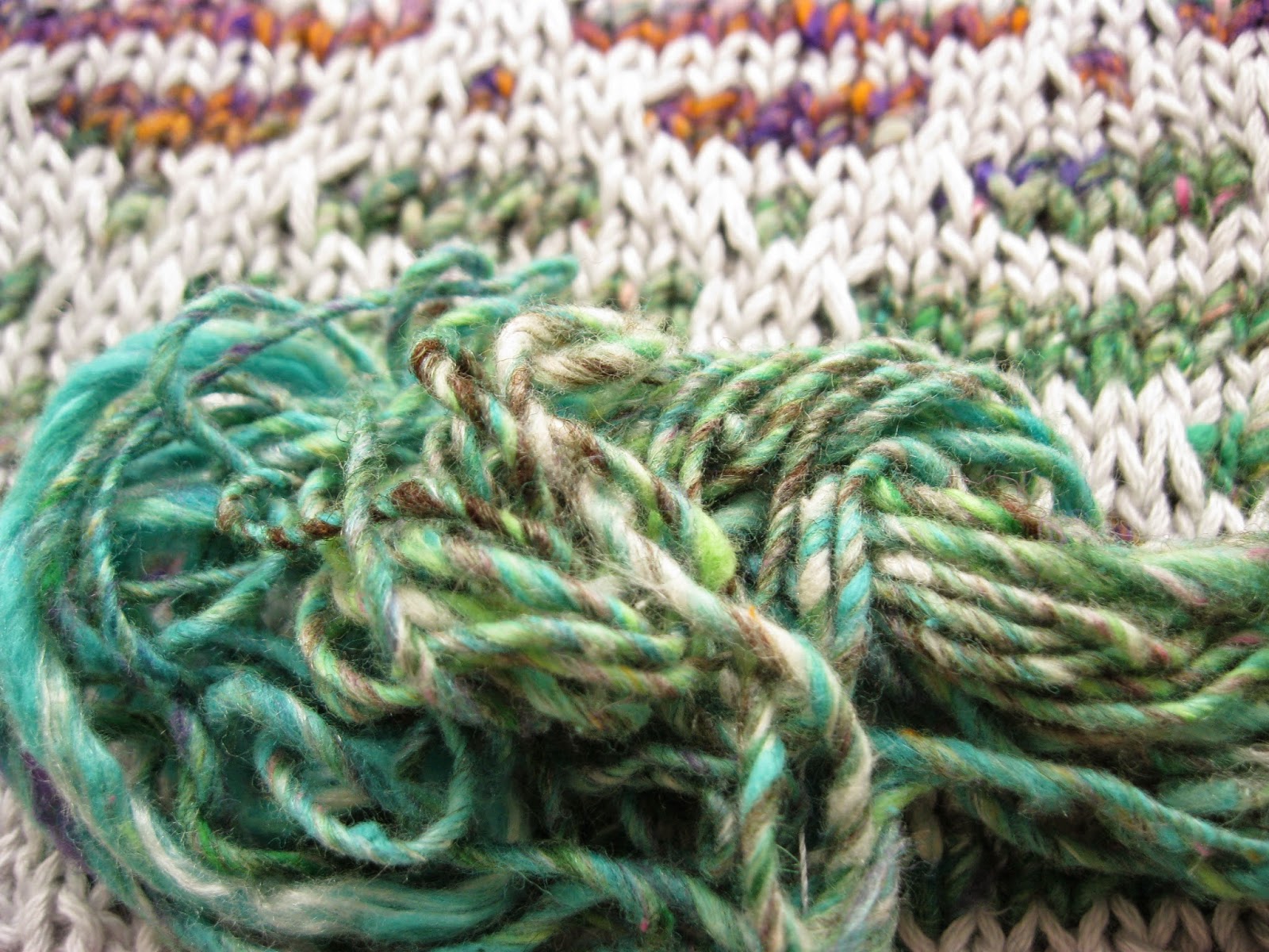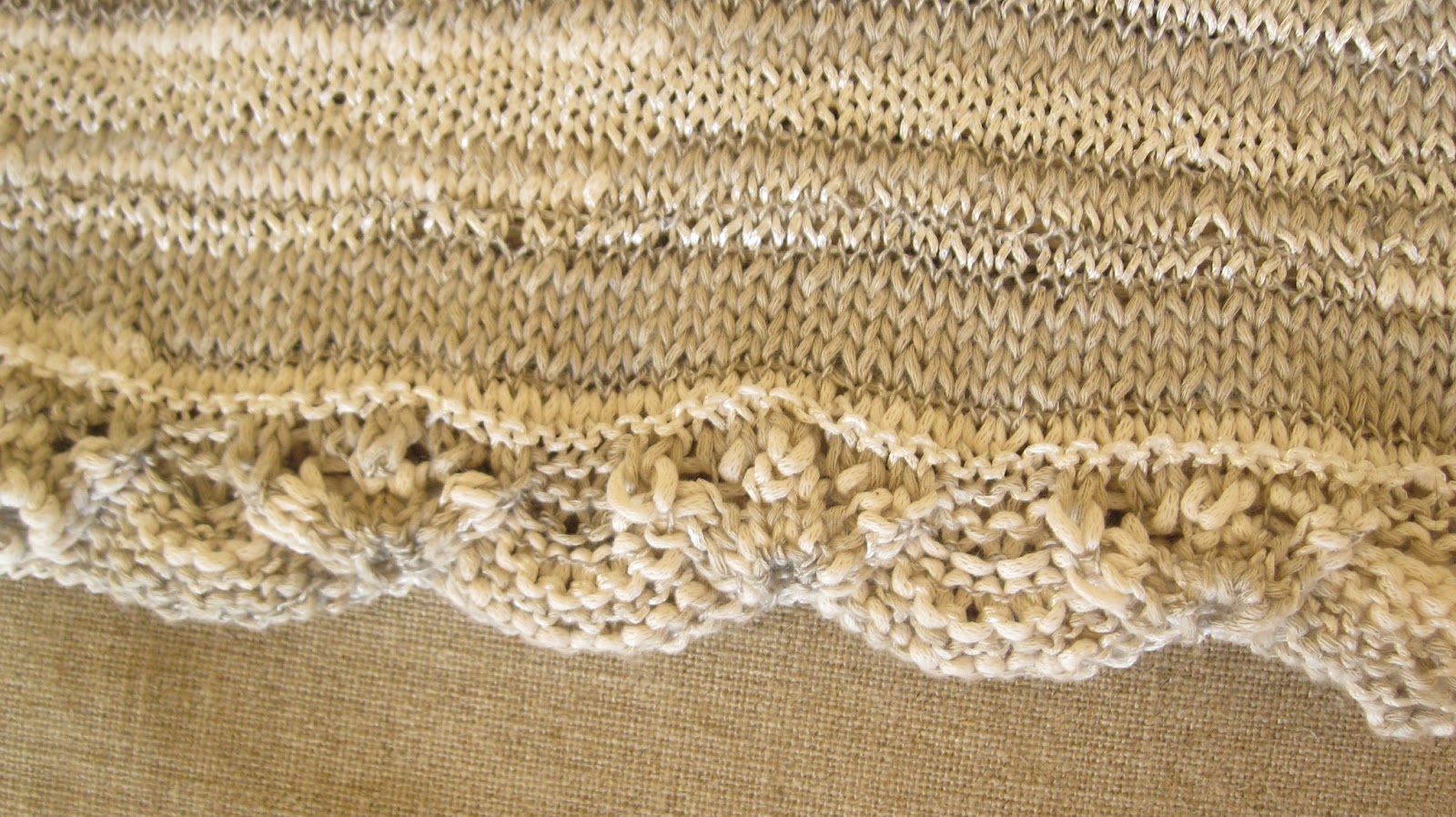 Mas nem tudo é linear quando se trabalha com cores que variam muito gradualmente ao longo do fio. Nestes casos a peça fica com riscas coloridas, tanto mais largas quanto menor o número de malhas das voltas. Se isso é muito giro em écharpes, xailes, cachecois, tratando-se de uma peça para vestir, aí o caso muda de figura.